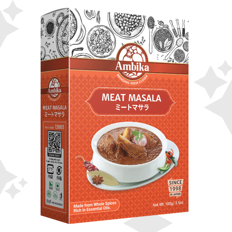 Ambika Meat Masala is an exotic blend of spices that adds color and has a pepper-coriander-chilli based blend that imparts a dark tan and a hot taste to non-veg dishes, especially meat.