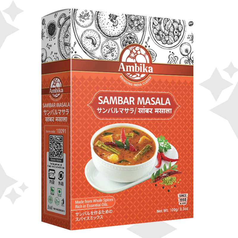 Where to use: Ambika Sambar Masala is used to prepare authentic south Indian Sambar using lentils & vegetables. You can use sambar masala to season different types of cooked lentils and pulses, like dal or lentil soups. It adds depth and complexity to the dish.